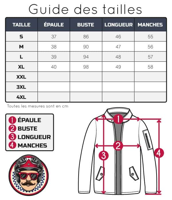 Info Mr.Biker : Pensez à vous référer au Guide des Tailles (en image) pour être sûr de commander la bonne veste !